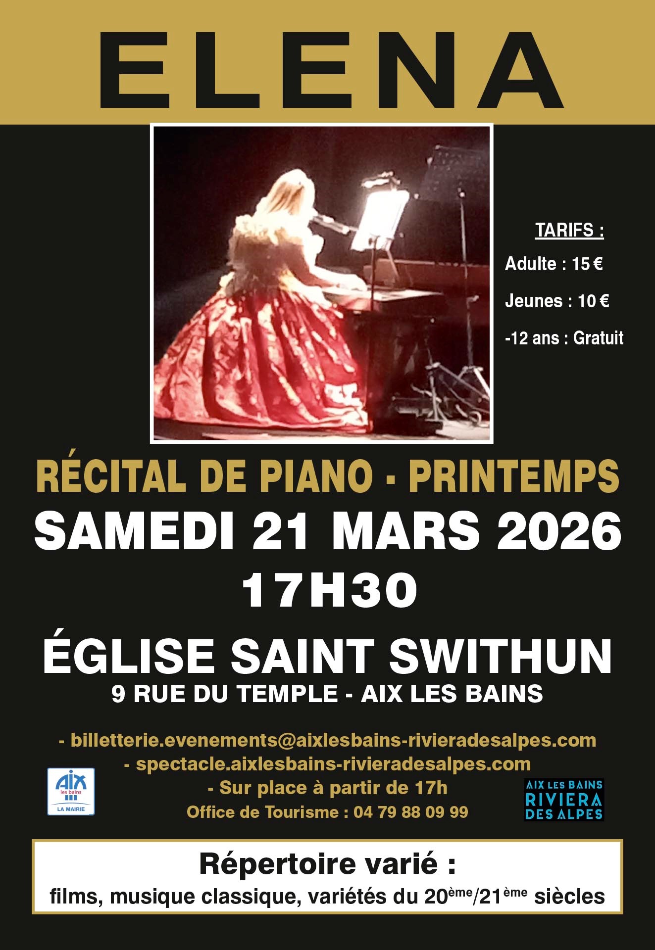 Dans ce magnifique premier jour de printemps 2026 ELENA vous propose ce premier récital de piano. C'est son nouveau répertoire de 20éme et 21éme siècles, avec les compositeurs Tiersen, Pauls, Doga, Khachaturian, Chostakovich, etc.